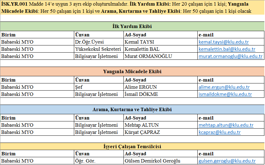 Kırklareli Üniversitesi İş Sağlığı ve Güvenliği Yönergesi doğrultusunda biriminiz çalışan temsilcisi ile birim acil durum ekip üyelerinin listesi