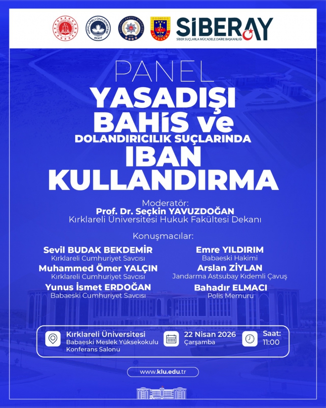 Yüksekokulumuz Amfi Salonu'nda 22 Nisan Çarşamba saat 11.00'de Prof. Dr. Seçkin YAVUZDOĞAN moderatörlüğünde "Yasa Dışı Bahis ve Dolandırıcılık Suçlarında IBAN Kullandırma" paneli düzenlenecektir. Tüm öğrenci ve personelimiz davetlidir.